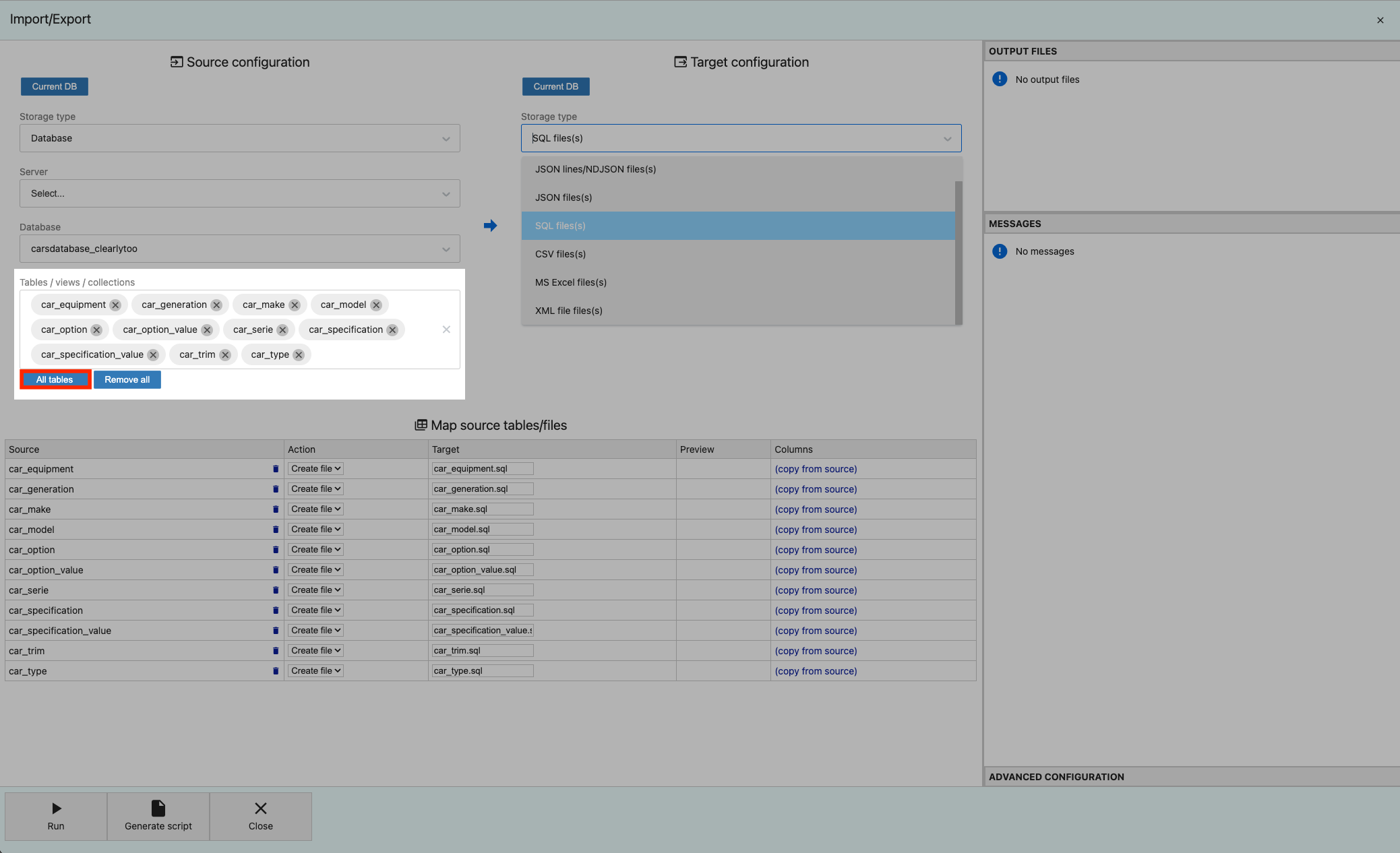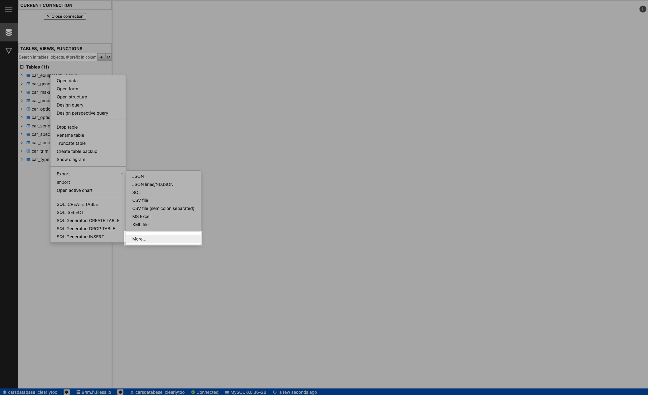 Right click a table/collection of your database and select Export > More. Select the table(s) that you would like to export and the output format. Click Run. Wait and you will get the download links